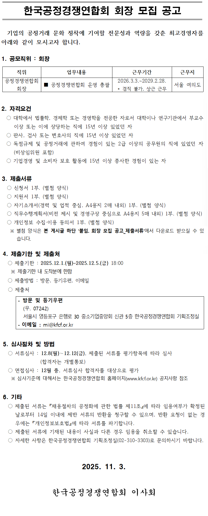 한국공정경쟁연합회 회장 모집 공고